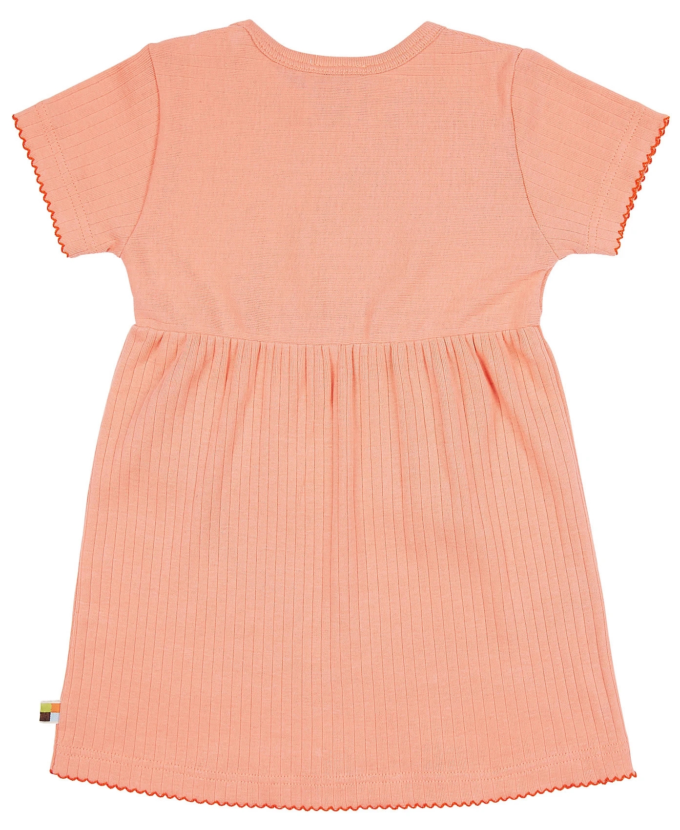 Kleid aus weichem Jersey. In der Taille gerüscht. Saum und Ärmelsaum mit kontrastfarbigen „Mäusezähnchen“ an der Kante. Logo-Etikett mit Fähnchen an der Seitennaht. Made in Hungary. Waschbar bei 30°C