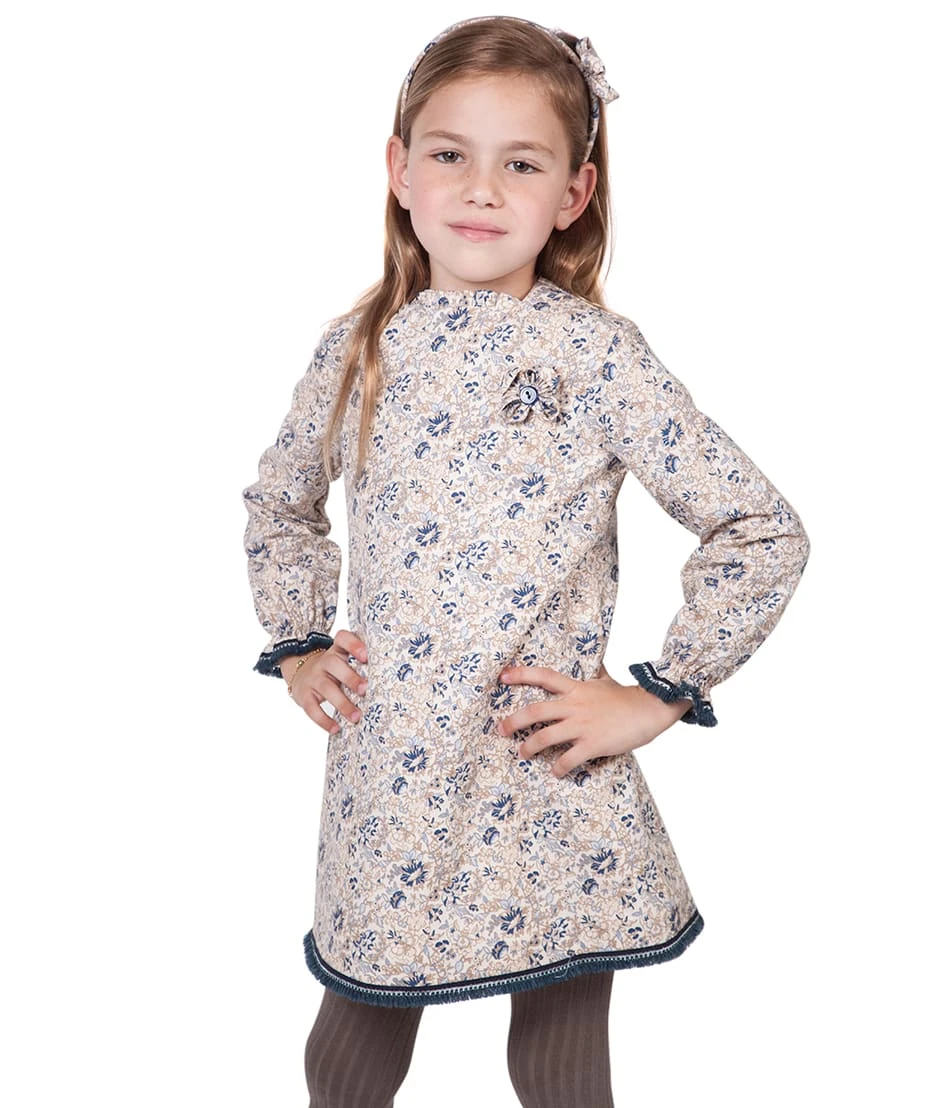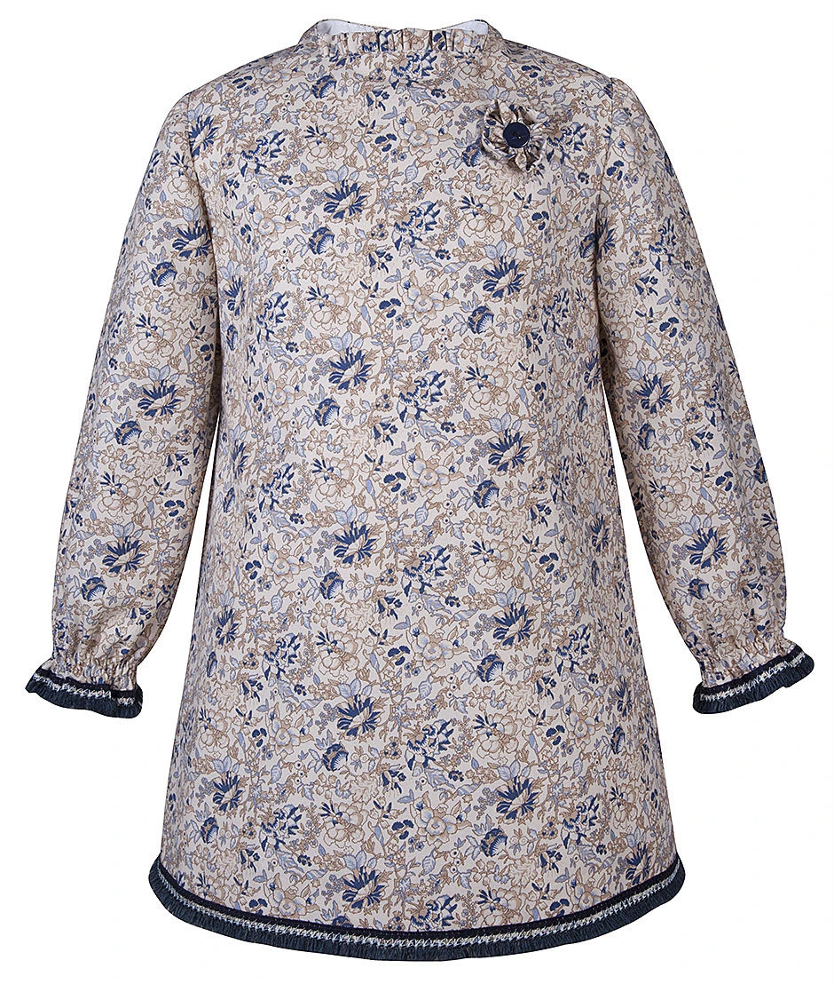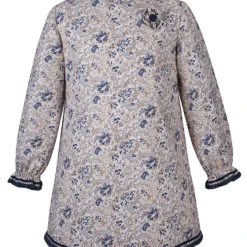 Bunt gemustertes, langärmliges Kleid mit blauen Zierbändern an den Ärmeln und am Kleidende. Im Brustbereich hat Eine Stoffblume und wird am Rücken mit Knöpfen geschlossen. Das Kleid besteht aus einem Mix aus Baumwolle und Polyester und bietet den Kindern ein gutes Tragegefühl.