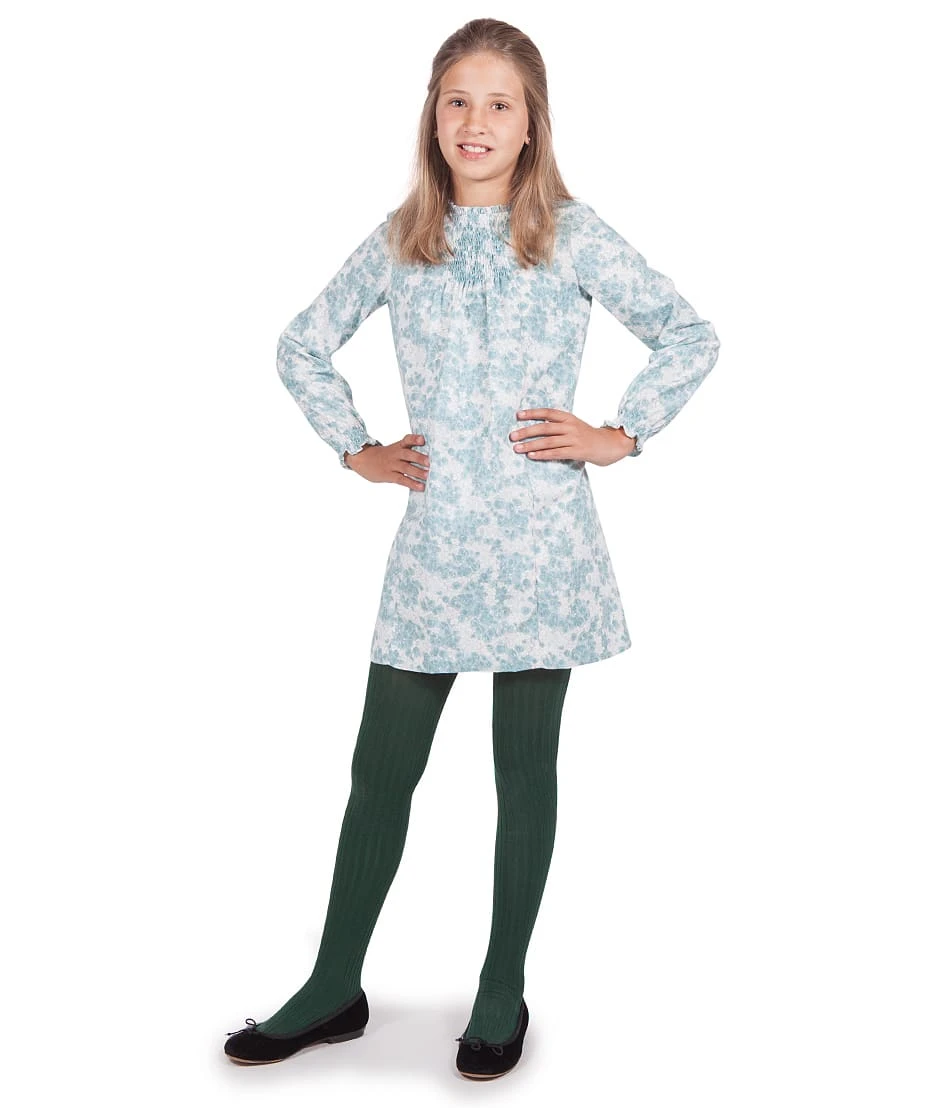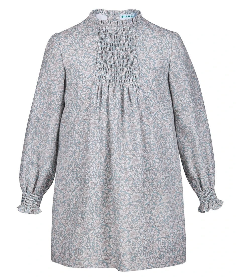 Wunderschönes langärmliges Kleid gemustert in Hellturquoise mit einem Plisseekragen und Smock am Brustbereich und Ärmelenden.
