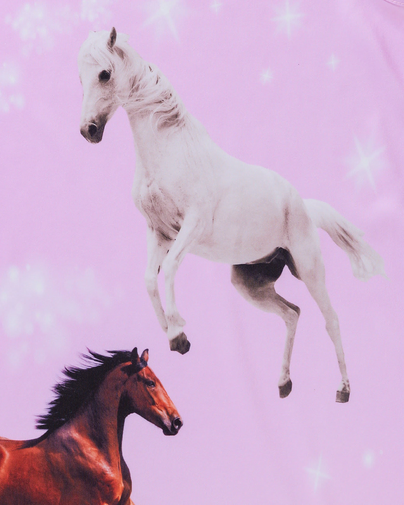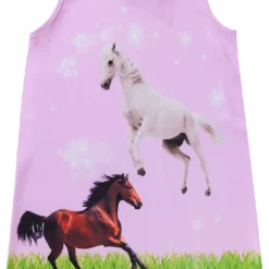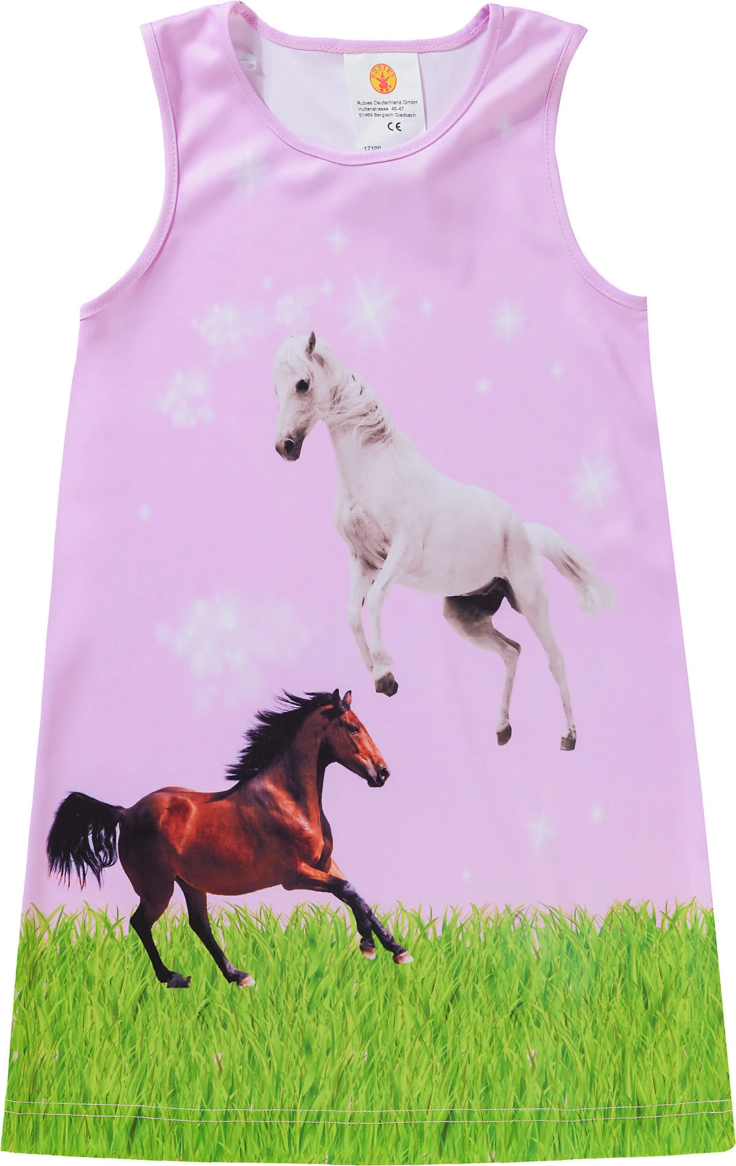 Ärmelloses, rosanes Kleid, auf dessen Vorderseite zwei Pferde auf einer Wiese aufgedruckt sind.