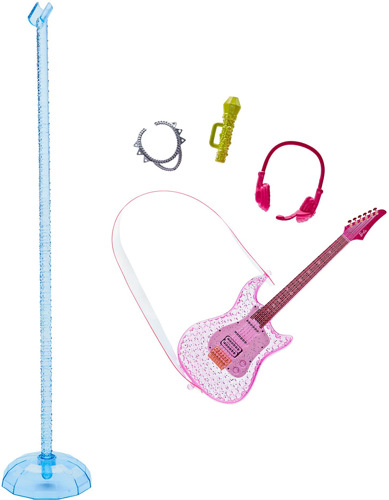 Heute ist barbie ein richtiger Rockstar! Auf ihrer E-Gitarre kann sie einzigartige Riffs und coole Melodien spielen und ist bereit für ihr erstes Konzert. Standmikrofon und Headset. Auch technisch bietet dieses Set die optimale Ausstattung. dazu darf natürlich ein besonders Bühnenoutfit nicht fehlen. In kunterbuntem Glitzerkleid stellt Barbie alle in den Schatten.